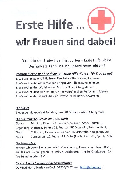 WIr wollen generell die freiwillige Erste Hilfe Leistung forcieren, Ängste nehmen und den Mut zur Hilfeleistung stärken. Die Kosten für die angebotenen Kurse wurden ursprünglich durch SPonsoren auf € 15 pro Teilnehmerin reduziert und zusätzlich unterstützen die ÖVP-Frauen Eggenburg die Teilnahme an dem Erste Hilfe-Kurs nochmals, d.h. die 50% der verbleibenden Kosten – also €7,50 – werden den Teilnehmerinnen nach Absolvierung des Kurses von der ÖVP Eggenburg refundiert.“ Kontakt: Vizebgm. Margit Koch und STR Susanne Satory Bitte um rasche Anmeldung bei ÖVP-BGS Horn Maria van Dyck 02982/2407 bzw. horn@vpnoe.at