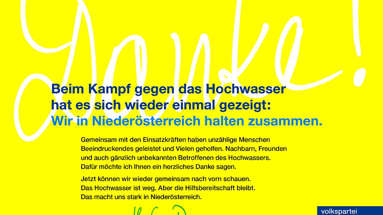 Gemeinsam mit den Einsatzkräften haben unzählige Menschen Beeindruckendes geleistet und Vielen geholfen. Nachbarn, Freunden und auch gänzlich unbekannten Betroffenen des Hochwassers. Dafür möchte unser Landeshauptmann Dr. Erwin Pröll ein herzliches Danke sagen. "Jetzt können wir wieder gemeinsam nach vorn schauen. Das Hochwasser ist weg. Aber die Hilfsbereitschaft bleibt. Das macht uns stark in Niederösterreich."