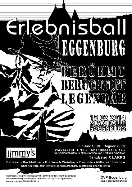 Am Samstag, den 15. Februar 2014 ist es wieder soweit: Die ÖVP Eggenburg lädt zum Erlebnisball 2014 Vorverkaufskarten sind in allen Banken und Trafiken in Eggenburg erhältlich.NEU auch am Eislaufplatz Eggenburg sind Karten erhältlich. Anrufsammeltaxi erreichen Sie unter : 0650 / 9623515 Tischreservierung unter : 02984 / 26 46